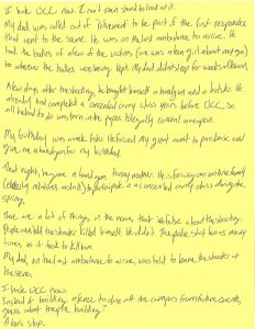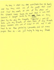 My story is about my dads work and how they were one of the groups that went and lined the roads on one of the days all the students came back.
